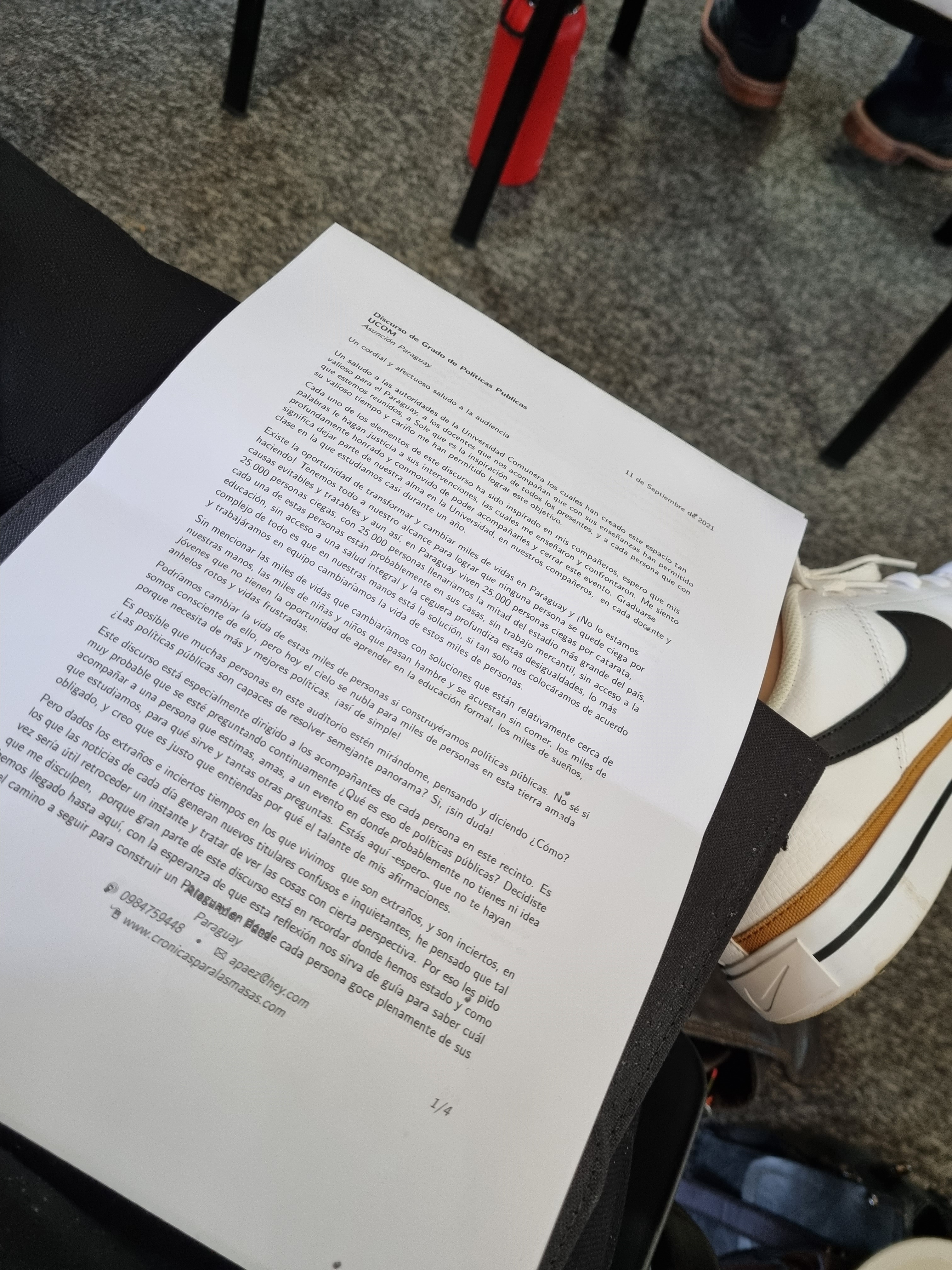 Cada uno de los elementos de este discurso ha sido inspirado en mis compañeros, espero que mis palabras le hagan justicia a sus intervenciones, las cuales me enseñaron y confrontaron. Me siento profundamente honrado y conmovido de poder acompañarles y cerrar este evento. Graduarse significa dejar parte de nuestra alma en la Universidad, en nuestros compañeros, en cada docente y clase en la que estudiamos casi durante un año.